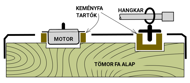 Jobb megoldás a motort és a hangkart is egy tömör fa alapra szerelni, ami sokkal jobban