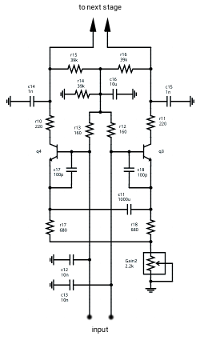 MC head amp. I tried this circuit and found it the best of all: it has low noise and good immunity against EMI. Usually the simpler is the better - as in this circuit too. The more complicated circuits produced more problems for me: not just more noise, but radio reception (EMI), and others. I am not against feedback, but in this case the feedback circuit increases the impedance in the base-emitter stage which means more noise, and decreases the EMI immunity. The input decoupling capacitor has large value for the same reason: reducing it to e.g. 220uF increses the noise in the lowest range significantly (see Inb and Vnb description on the noise calculation page). There are better transistors today, see below. |